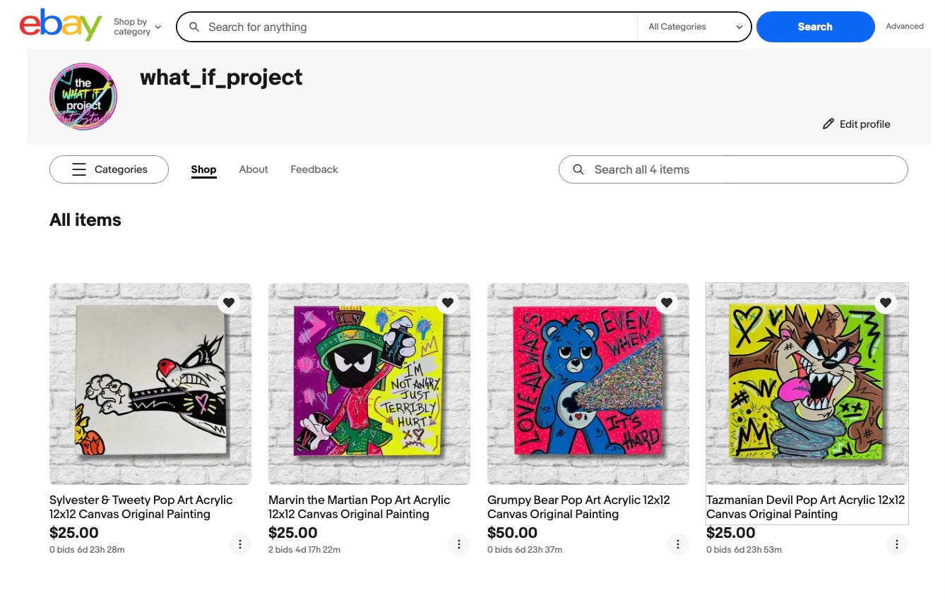 ALSO - my art is on EBAY. Most pieces having a starting bid of $25 or can be purchased outright. I make the most $$ if an offer is made via DM, but you’re welcome to purchase via eBay as well!