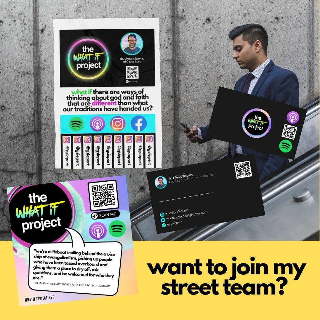 I'm putting together a "Street Team" for the What If Project! As part of the team I would mail you 10 or so flyers, stickers, and business cards and ask you to leave them in various places in your community. Perhaps a community board at a grocery store, Starbucks, or more progressive-minded church.