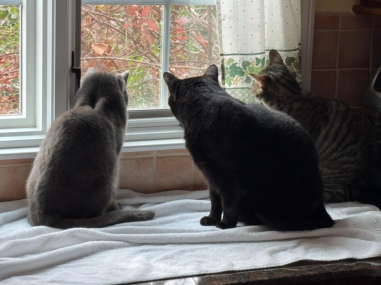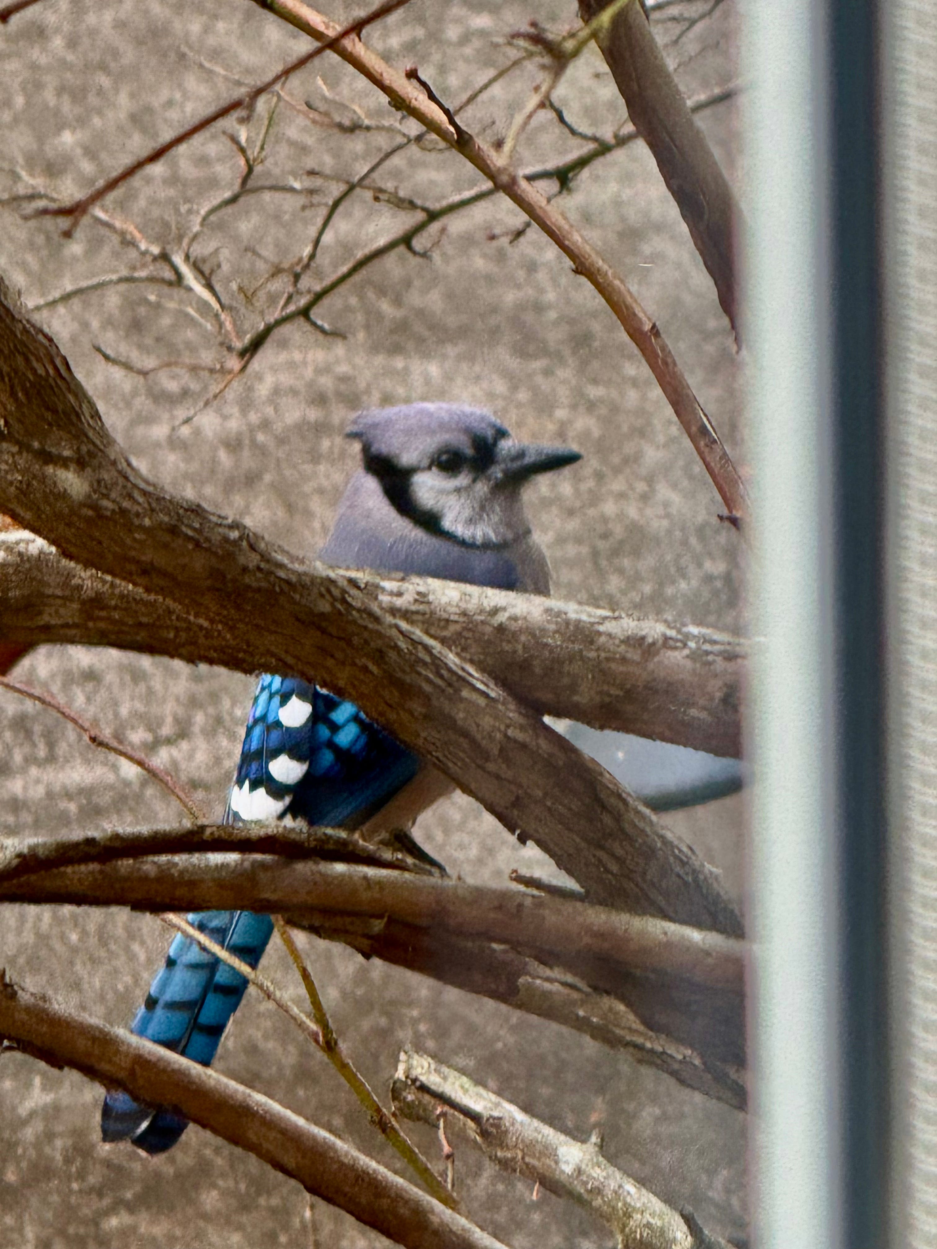 She said she didn’t need anything and we talked for a few minutes while I drove home and then she said, “wow, there is the BIGGEST blue jay outside the kitchen window right now and the 3 cats are sitting on the counter staring at it and it’s just staring right back at them!”