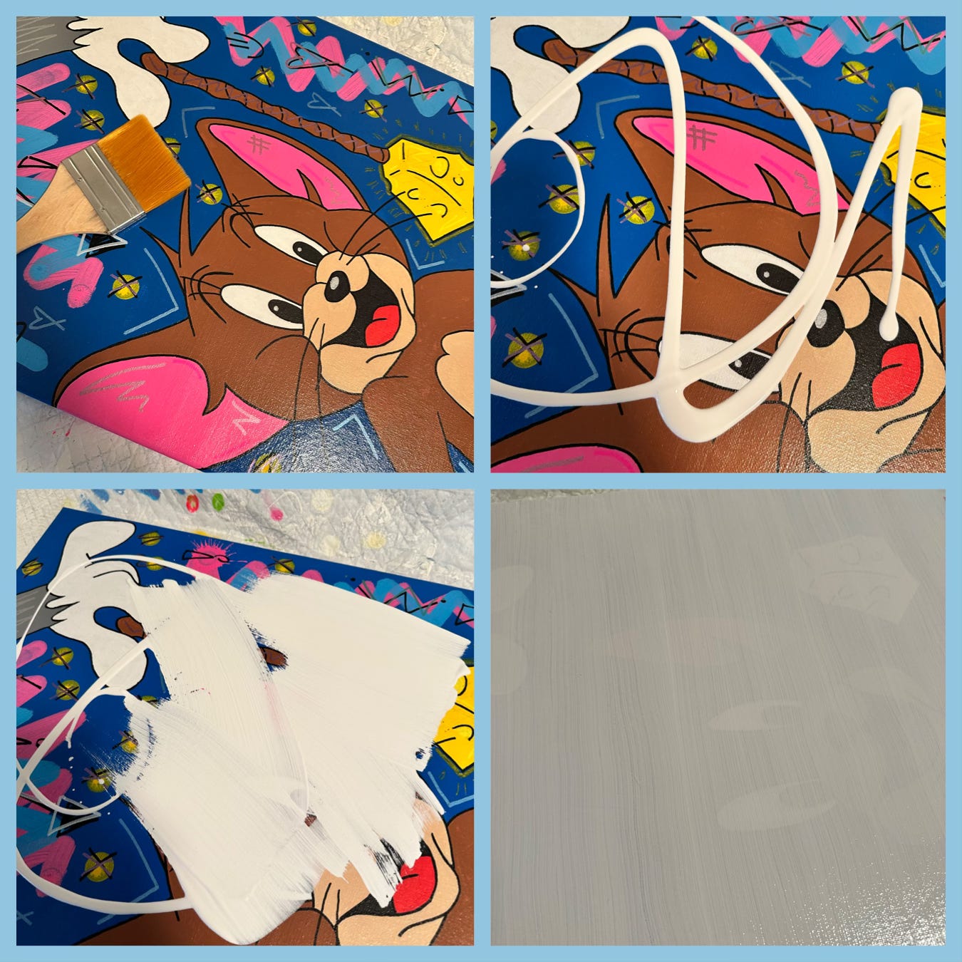 And so, I decided to “begin again”. I got out my brush and my primer and I primed over a piece of art that took me a couple of weeks to make so that I could do a different “Tom and Jerry” piece that I’ve had in mind for a while.