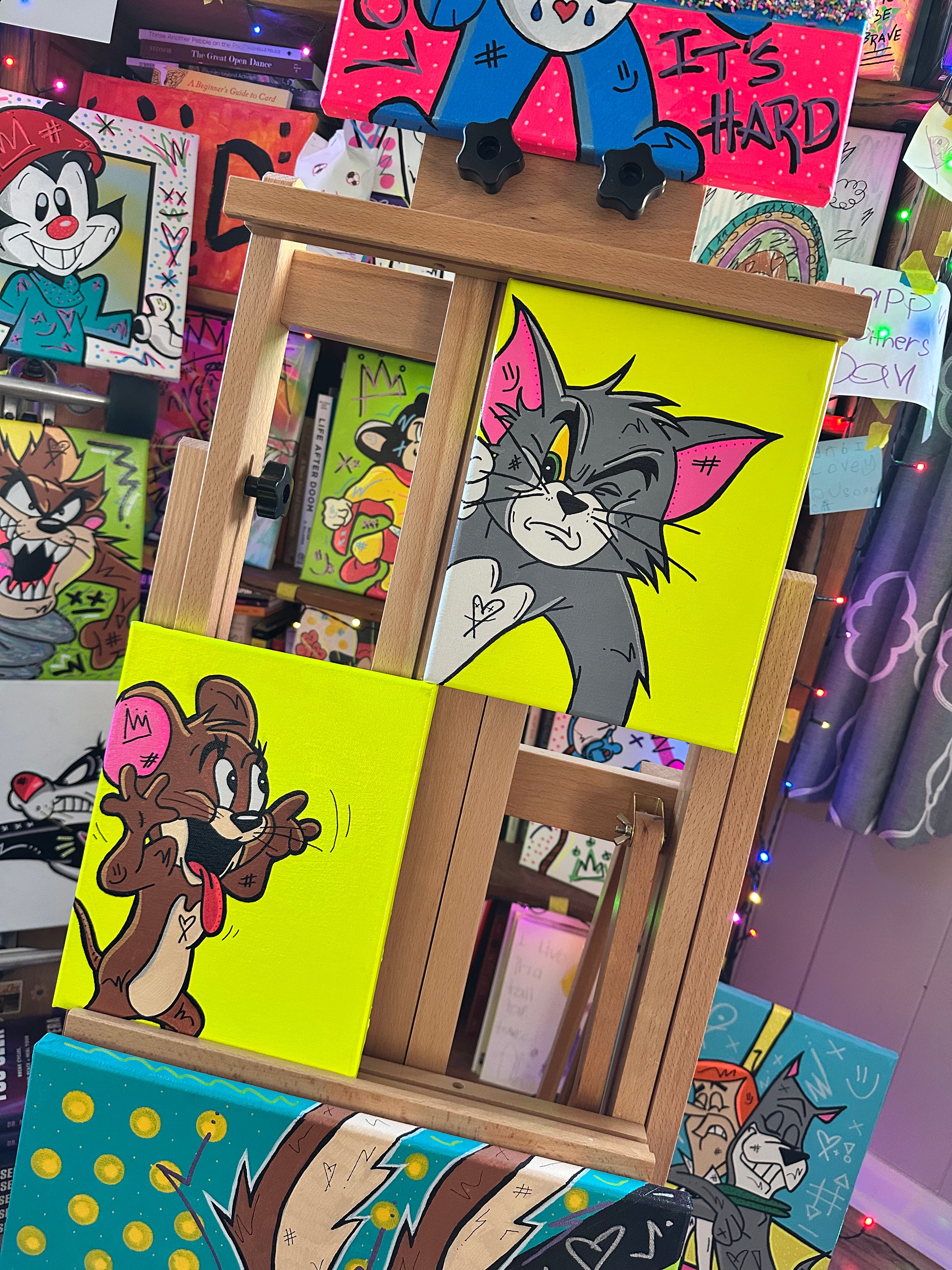 This one is 2 separate canvases that (together!) make up 1 story - Jerry’s relentless teasing of Tom and Tom’s refusal to ever throw in the towel on catching Jerry.