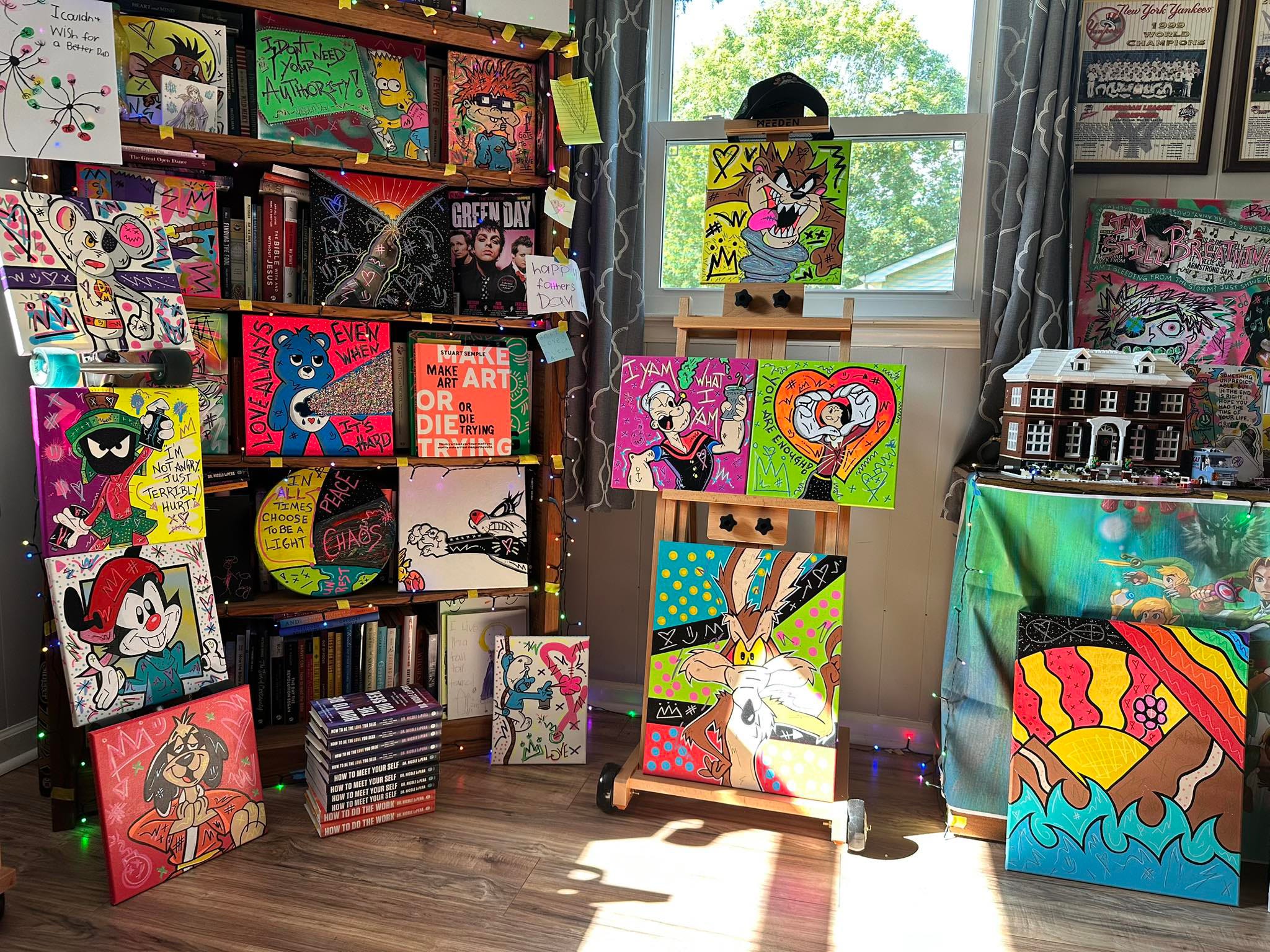 I posted this on Facebook/Instagram the other day and wanted to share it here. This is a photo of my office and the art I have available displayed here, there, and everywhere.